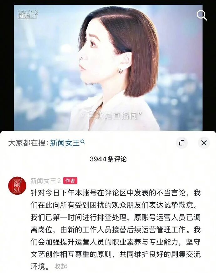 当晚《新闻女王2》官号发文致歉:“针对今日下午本账号在评论区中发表的不当言论,我们在此向所有受到困扰的观众朋友们表达诚挚歉意。我们已第一时间进行排查处理,原账号运营人员已调离岗位,由新的工作人员接替后续运营管理工作。我们会加强提升运营人员的职业素养与专业能力,坚守文艺创作相互尊重的原则,共同维护良好的剧集交流环境。”