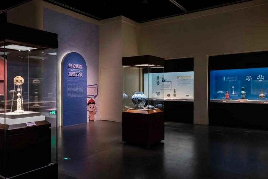 步入展厅,印入观众眼帘的是以历代典型器物纹饰为灵感,由缠枝纹、花卉纹、几何纹、神兽纹等组成的“藻井”图案。展厅顶部,各种古老的纹饰在现代灯饰的映衬下各竞芳华;地面辅以动态投影,构成一条流淌的“纹样长河”,步履所至,人画互动。