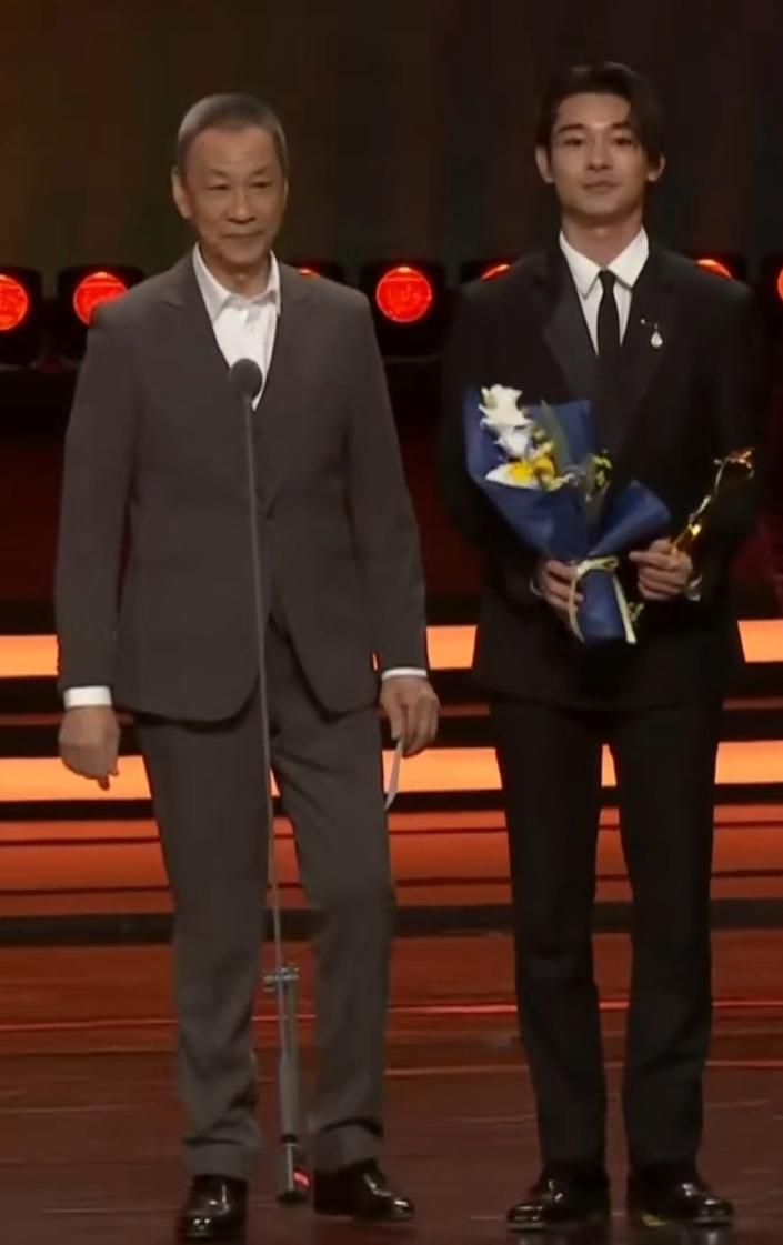 11月1日,79岁的演员王学圻在文荣奖颁奖典礼上以一身灰色西装造型亮相,为演员张宥浩颁发奖项。