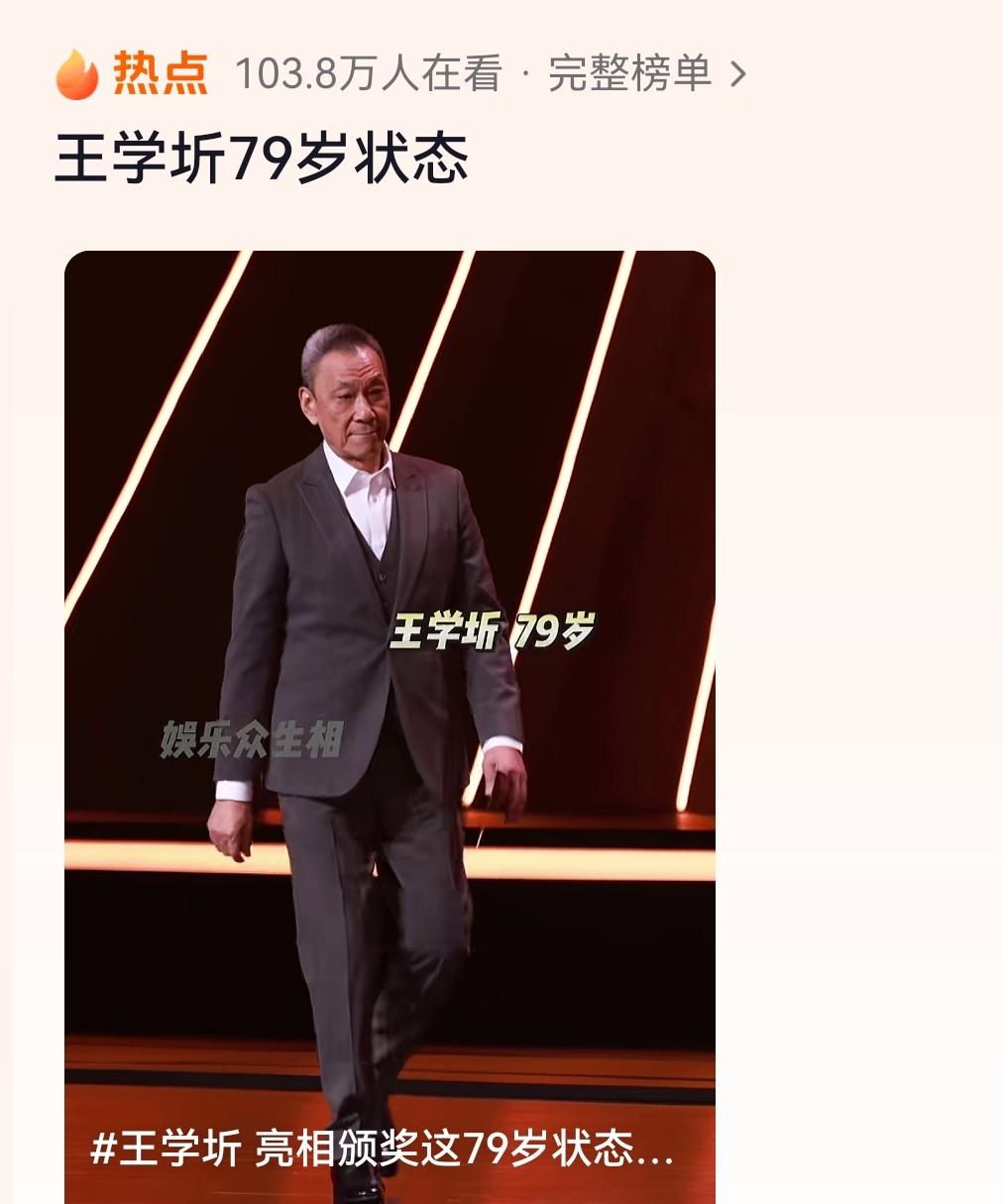王学圻头上并无太多白发,身姿十分挺拔。“王学圻79岁状态”也登上抖音热榜,让不少网友惊呼:真看不出来他79岁了,像49岁的。