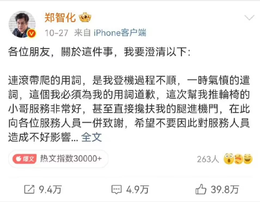 10月27日午间,郑智化发长文致歉:“连滚带爬的用词,是我登机过程不顺,一时气愤的遣词,这个我必须为我的用词道歉,这次帮我推轮椅的小哥服务非常好,甚至直接搀扶我的腿进机门,在此向各位服务人员一并致谢,希望不要因此对服务人员造成不好影响。因事件引发的对少数群体利益的关注,比我个人感受意义更大,交给社会各方讨论。”