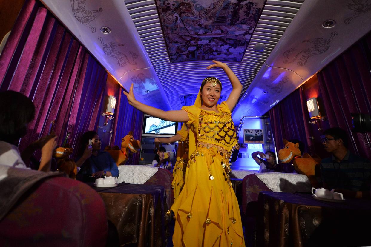 在兰州铁路局首发的“敦煌号”列车上,列车员身穿敦煌元素的服饰为旅客表演敦煌舞(2014年7月10日摄)。新华社记者 陈斌 摄