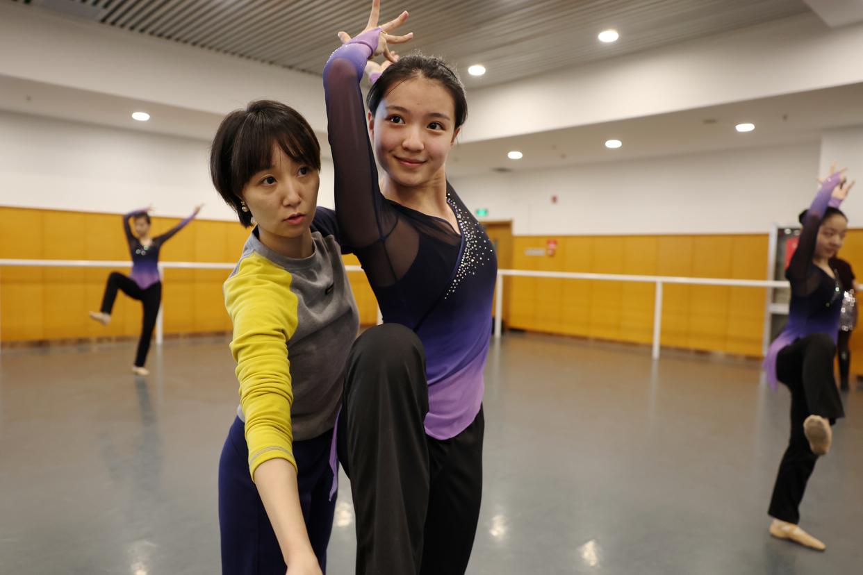 在敦煌市西关小学,舞蹈教师周保英在课后服务时间指导学生练习敦煌舞(2023年4月26日摄)。新华社记者 陈斌 摄
