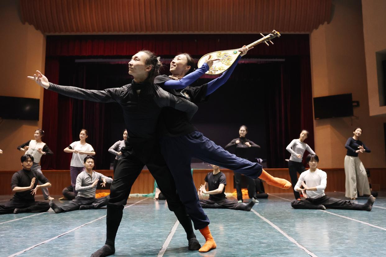 新版《丝路花雨》神笔张的扮演者罗志炜(左)和英娘扮演者康琦(右)在甘肃省歌舞剧院排练厅排练(11月3日摄)。新华社记者 陈斌 摄