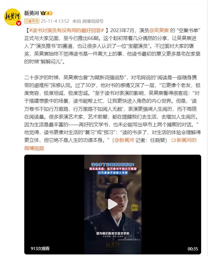 2023年7月,演员@吴昊宸 的 “空巢书单” 正式与大家见面,至今已推出66期。这个起初带着几分偶然的分享,让吴昊宸进入了“演员推书”的赛道,也让很多人认识了一位“宝藏演员”。不过面对大家的褒奖,吴昊宸始终不觉得读书是一件高大上的事,他读书最初的意义更多是宅在家里的时候“解解闷儿”。