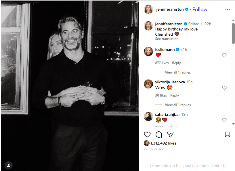 “生日快乐,我的爱人。永远珍爱。”56岁的安妮斯顿在两人拥抱的照片旁写道。