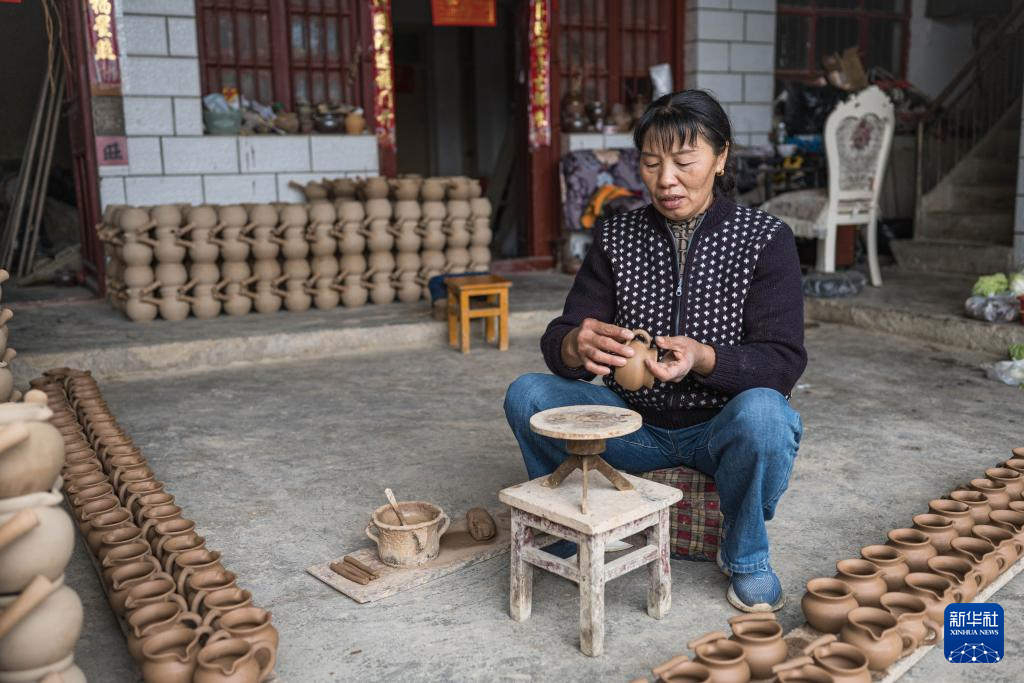 11月5日,村民在云南省曲靖市潦浒村自家院落中制作陶器。