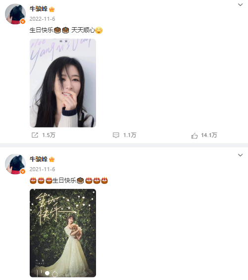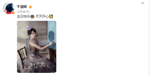 11月6日凌晨,演员牛骏峰凌晨卡点为杨紫庆生:生日快乐 天天开心