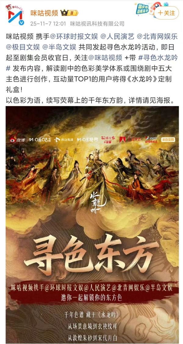 在剧集热播期间,咪咕视频联合环球时报文娱、人民演艺、北青网娱乐、文娱、半岛文娱等多家权威媒体,共同发起#寻色水龙吟#美学企划活动,以色为媒,引导公众探寻东方色谱的当代诠释。这场活动在社交平台引发热烈讨论,形成了多层次的美学对话。