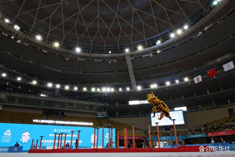 11月11日,湖南队在第十五届全国运动会群众展演舞龙舞狮南狮自选项目决赛中。新华社记者 王鹏 摄