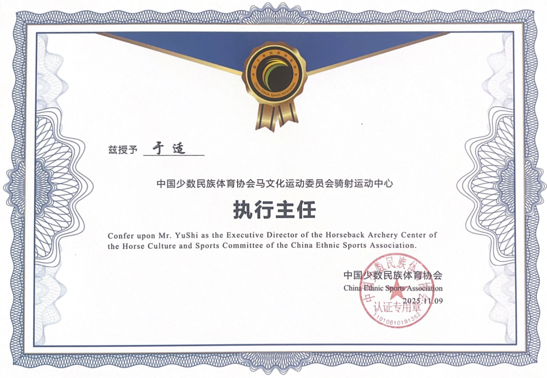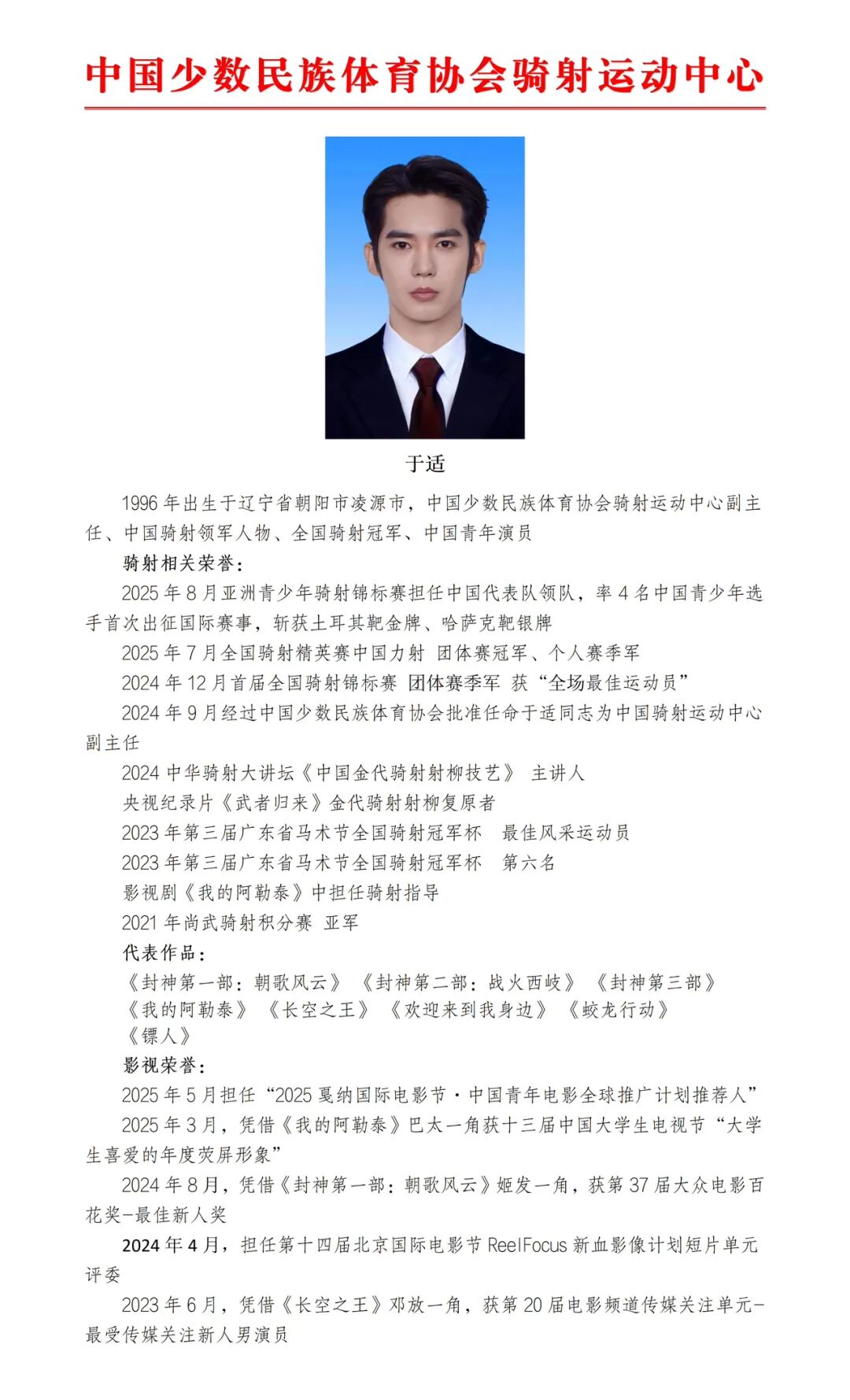 本次任命旨在充分发挥于适在骑射运动领域的专业能力与社会影响力,强化骑射运动在青少年群体中的传播与推广,促进中华优秀传统体育文化的创新发展与国际交流。于适长期致力于中华骑射文化的传承与弘扬,既是一位优秀的竞技骑射运动员,也是一位在影视文化领域具有广泛影响力的青年代表人物。他以实际行动诠释了“文化自信、尚武精神”的核心理念,为骑射运动注入了时代活力与青年力量。