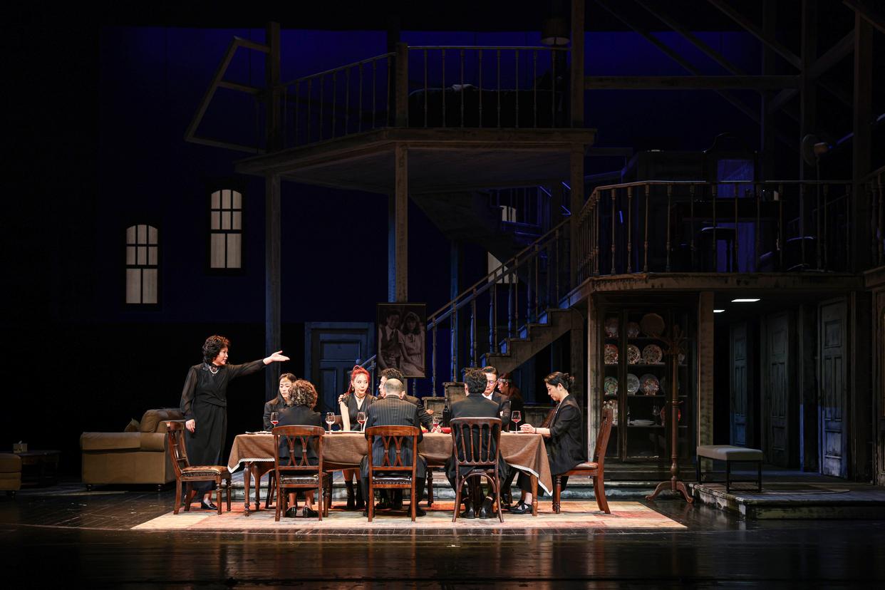 舞美设计申奥介绍,他采用线条、框架元素,将三层楼高的房屋搬上舞台,并以昏暗杂乱的布置营造一种压抑、沉闷的氛围。