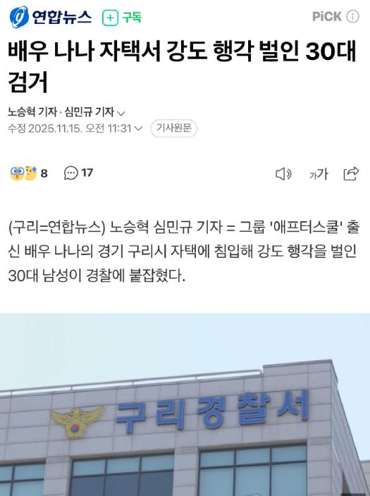 据韩媒,11月15日,韩国一名30多岁男子闯入组合 After School 出身的演员@NANA_林珍娜位于韩国京畿道九里市住宅并实施抢劫。