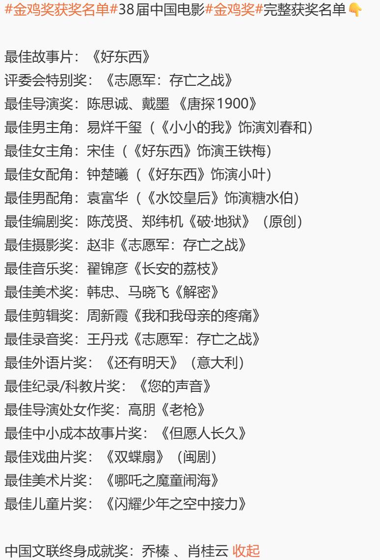 恭喜袁富华老师!恭喜思诚导演!恭喜墨导!恭喜小花!恭喜千玺!恭喜楚曦!恭喜所有获奖的朋友们!今年很开心!我不遗憾!明年我会继续带着作品,和大家金鸡再会!我很贪婪,我不会放弃,我相信人定胜天,谢谢中国电影金鸡奖。