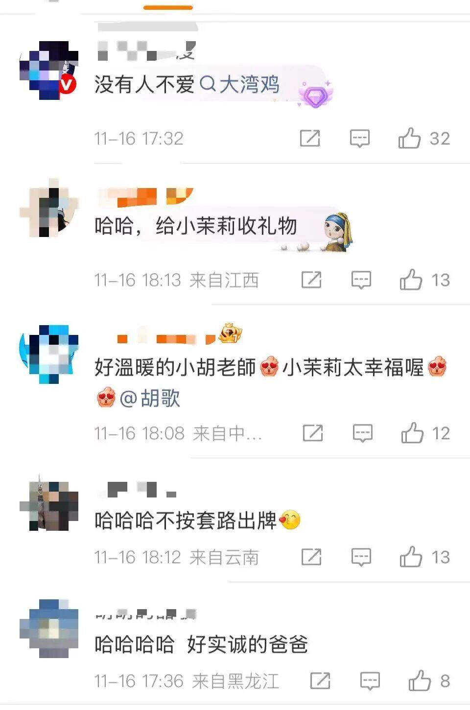 有粉丝送来的“大湾鸡”,主持人刚说完,心意收到,现场不收礼。胡歌却立马奔向粉丝:我想收,我女儿一定喜欢。