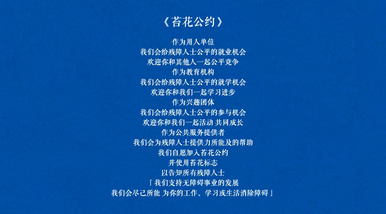 这是由新华社联合中共成都市委宣传部、《小小的我》电影团队一同发起的《苔花公约》公益活动,旨在号召社会各界关注残障人士,帮助残障人士,给予残障人士公平的机会与平等的关怀。任何愿意支持残疾人事业和无障碍事业发展的单位或组织机构,无需申请,只要使用或张贴苔花标志,即意味着宣告加入《苔花公约》。