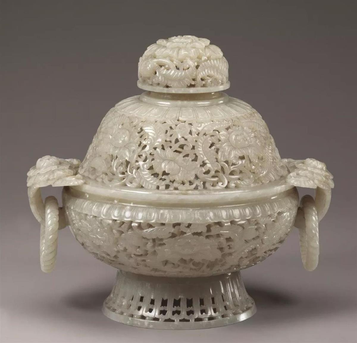 中国国家博物馆藏的清代玉镂雕菊花纹花熏,是玉器中菊纹装饰的珍品。和田青白玉质地莹润,全器以镂空工艺雕刻缠枝菊花纹,从盖纽的盛开菊朵到腹部的婉转花枝,再到耳饰的菊花造型,层层叠叠,疏密有致。香熏上下通透,点燃香料后,香气从菊纹镂空处缓缓溢出,玉的温润与菊的清芬交融,尽显宫廷陈设的雅致。