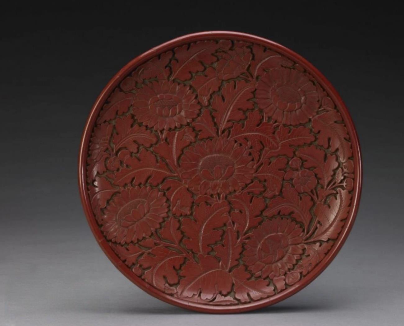 剔红菊花纹圆盘为明代永乐年间制作的漆器文物,现藏于故宫博物院。盘心雕刻盛开的团菊纹,花瓣层层叠叠,花蕊饱满,周围环绕缠枝菊纹,枝叶婉转缠绕,疏密得当。红漆的艳丽与菊纹的清雅形成巧妙对比,既显华贵,又不失雅致。