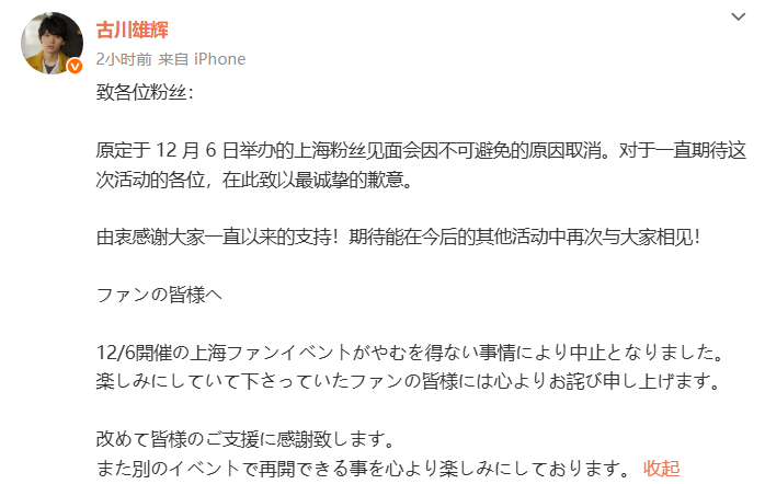 日本演员古川雄辉在微博发文确定粉丝见面会取消,向大家致歉。