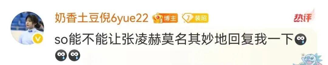 11月21日,中国击剑运动员倪琪瑶获得第十五届全运会女子重剑团体银牌后,在个人社交平台发文分享成绩,她还在评论区在线呼叫偶像张凌赫,“张凌赫能不能莫名其妙地回复我一下”。