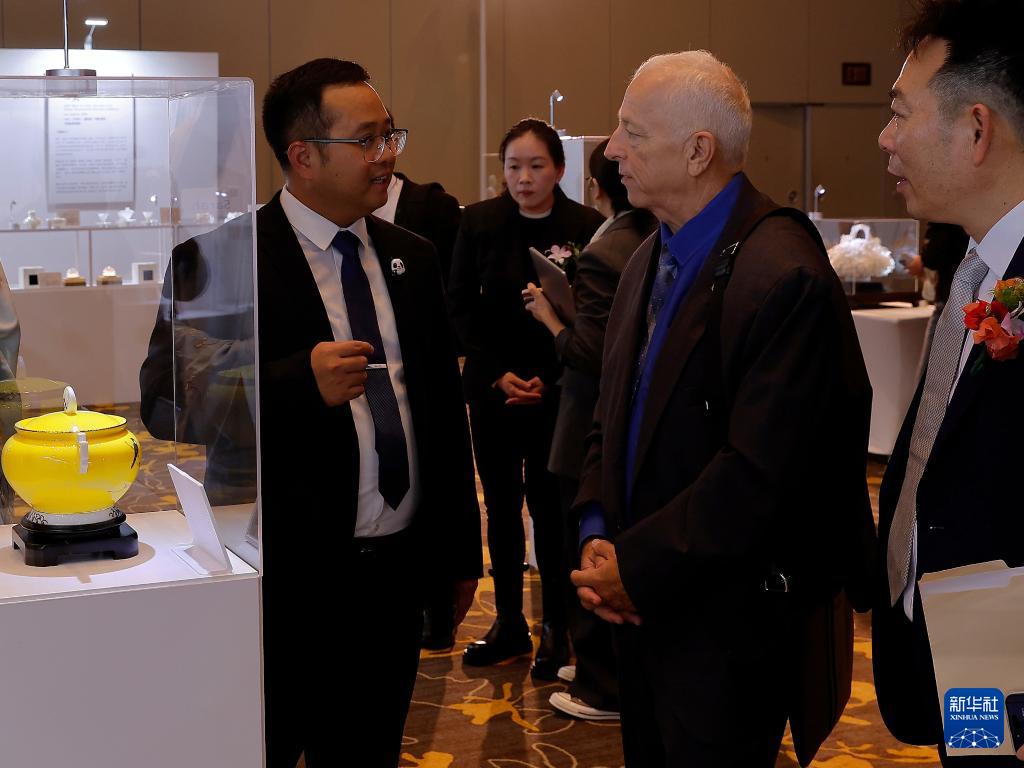 11月21日,在美国洛杉矶举行的“中国白·德化瓷”国际巡展上,福建省德化县县委书记方俊钦向观众介绍展品。新华社发(邱晨 摄)
