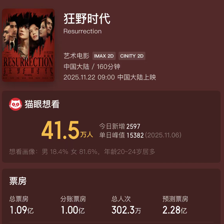 据猫眼专业版显示,截至11月23日15:25,《狂野时代》累计票房1.09亿。