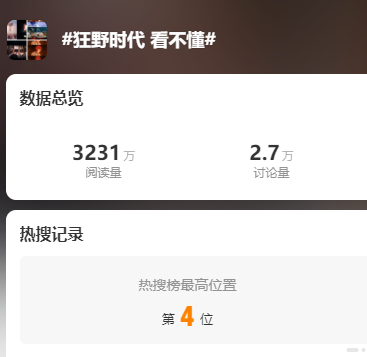 有网友发表短评表示:“看睡着了”“看不懂”。词条“狂野时代 看不懂”也登上了微博热搜榜。