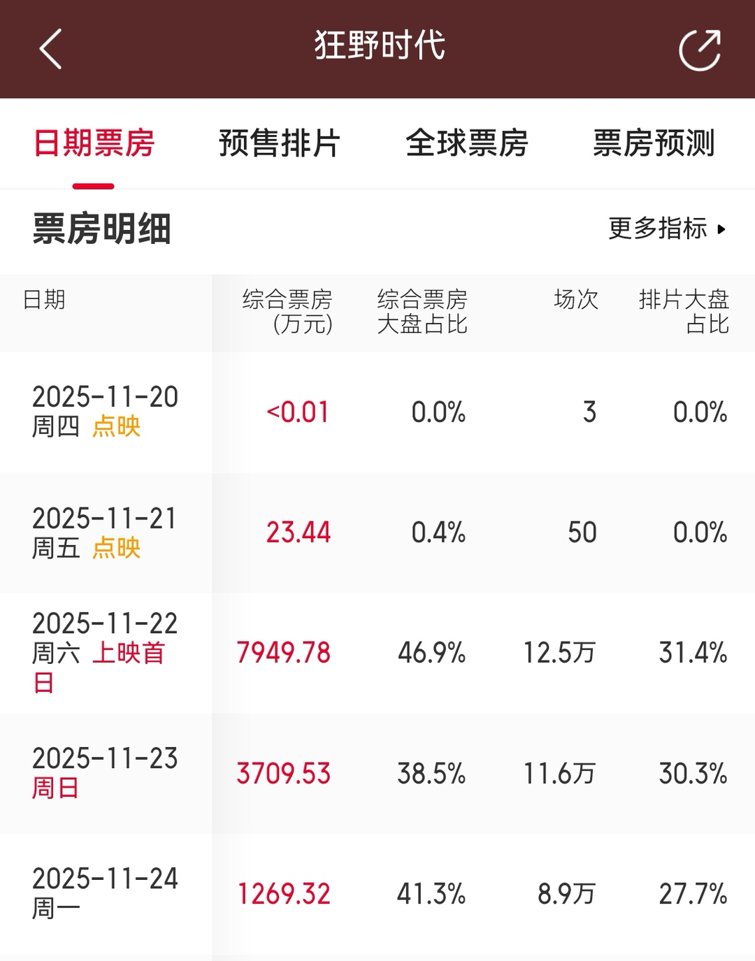 值得关注的是,该影片上市首日的退票率在个别平台上已接近15%。据猫眼专业版,《狂野时代》上映首日(即11月22日),大盘退票人次达25.6万,大盘退票率达10.5%;猫眼退票人次达15.4万,猫眼退票率达14.8%。退票率和同期部分热门影片相比,略偏高。此外,11月22日、23日该影片的网售票房占比分别为75.4%、57.6%,较同期热门影片偏低。