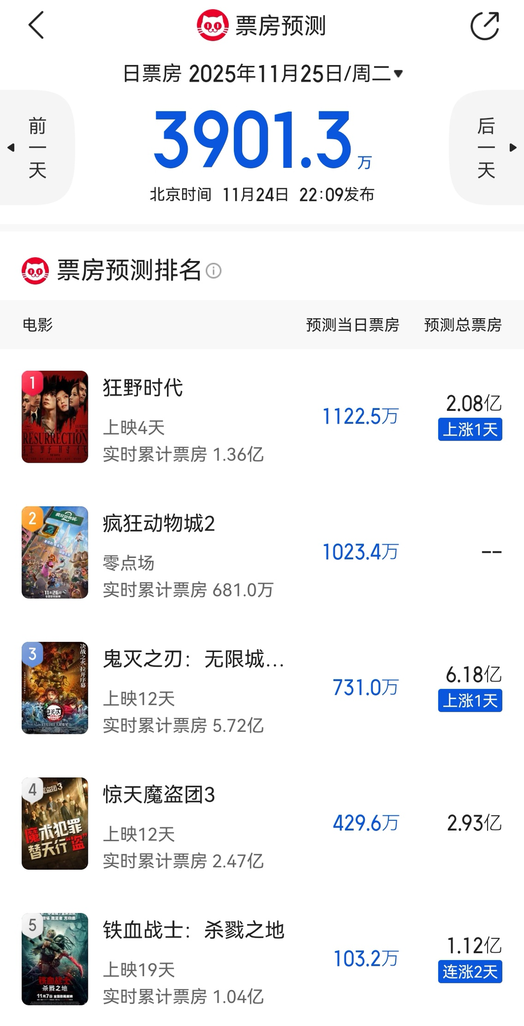 《狂野时代》于11月22日全国公映。据猫眼专业版数据显示,该影片上映前三日票房分别为7949.78万元、3709.53万元、1269.32万元。截至11月25日8时,影片累计票房为1.36亿元。最新预测总票房为2.08亿元。