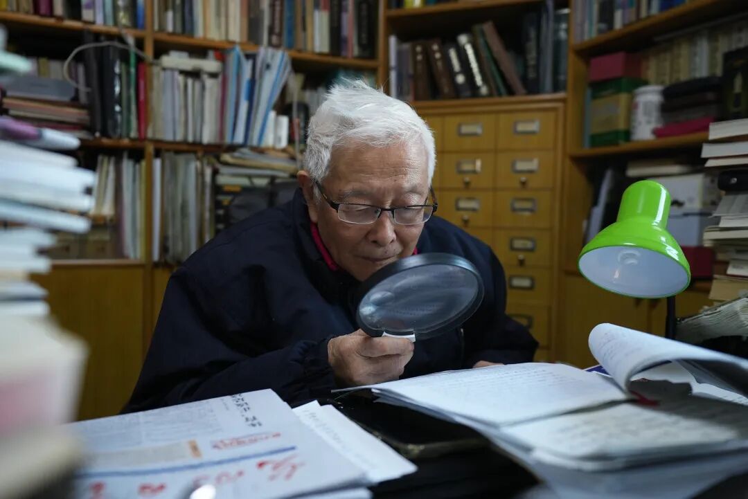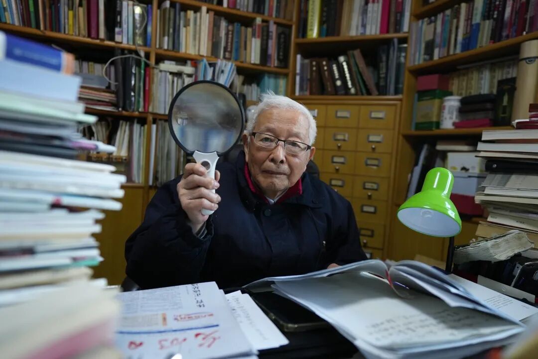 方汉奇举着大号放大镜。摄/孙宁伯