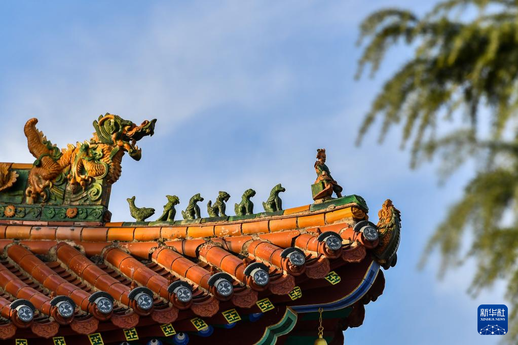这是11月14日在山西省运城市解州关帝庙拍摄的古建顶上的装饰构件。
