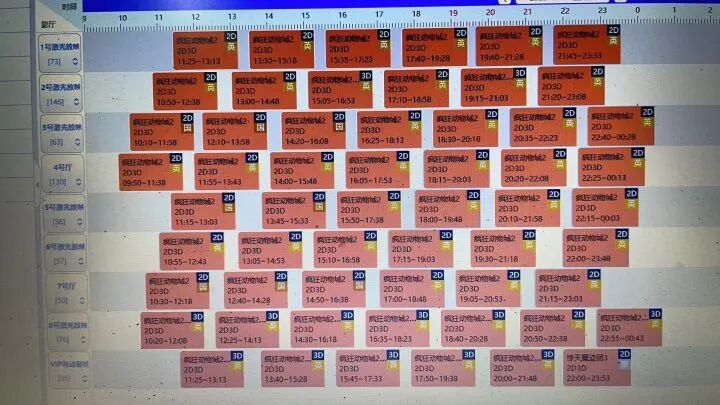 这还不算夸张,中影星宇影城(西子山姆店)昨天《疯狂动物城2》的排片率已经超过九成。该影城负责人高磊给记者看了下昨天的排片表,一眼望去,真的是清一色的《疯狂动物城2》,“周六只拿了一两场出来,排了其他影片,周日直接只排了一场《惊天魔盗团3》,其他全排的《疯狂动物城2》”。不过他也表示,因为是周末人多才这么排,到了下周一,还会做相应的调整,让更多有其他需求的观影人群也能够到影城来。他还表示,周六的观影人次还会打破影城于今年2月14日创下的最高纪录。