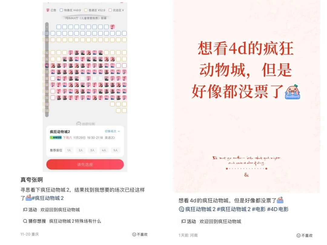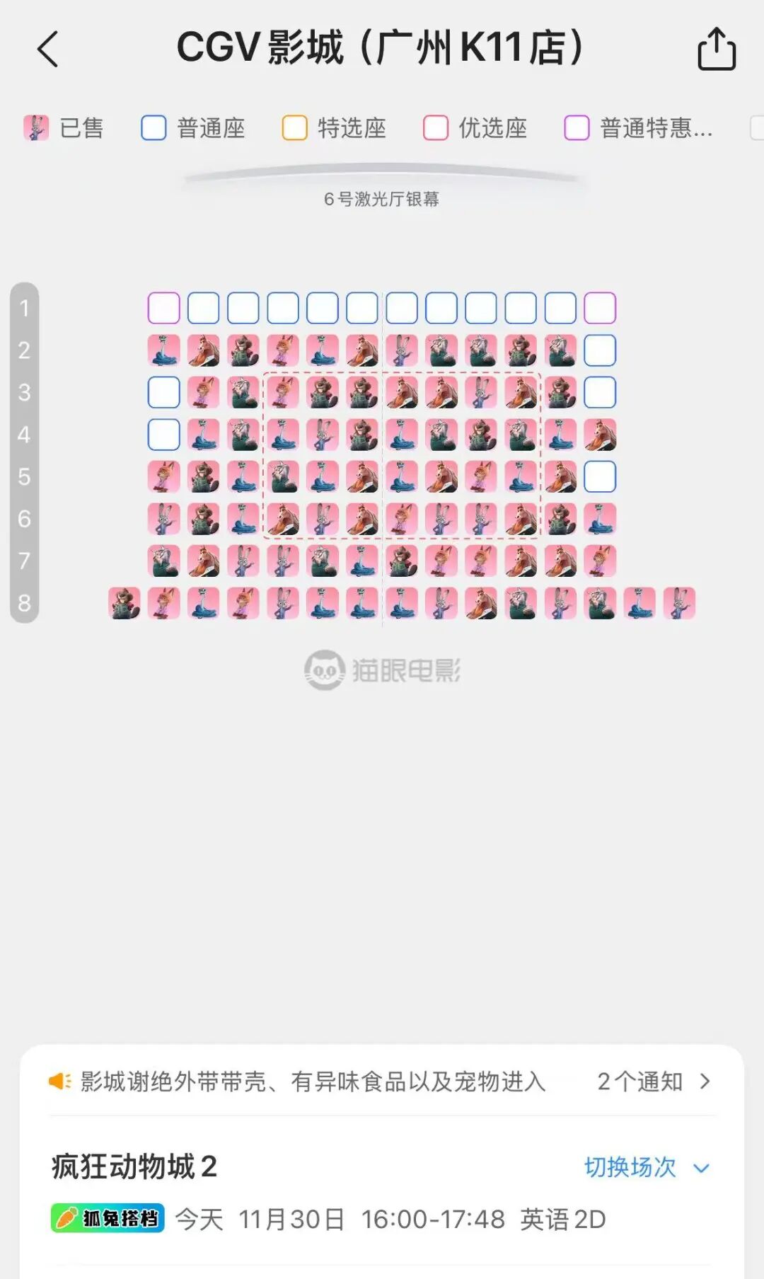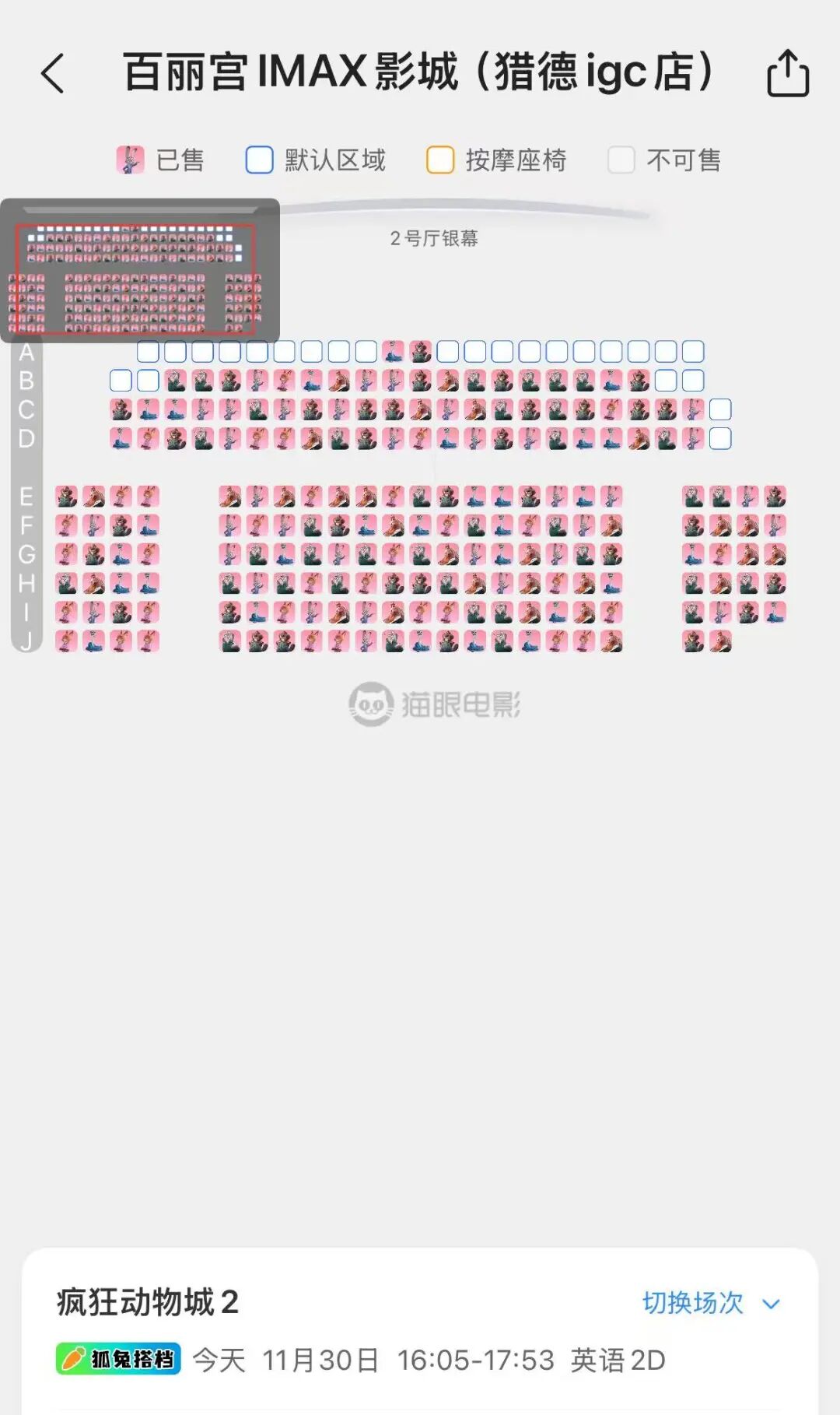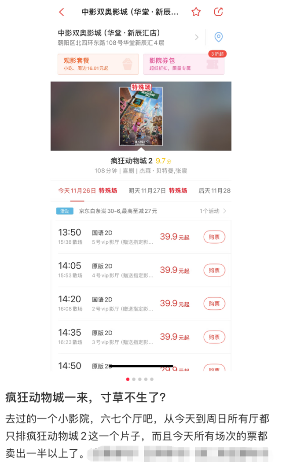 济南一影院经理李言鲁对记者说:“在这个时间段,《疯狂动物城2》没有对手。一些影厅数量较少的影院,全天只排这一部片子。如果不提前买票,这个周末只能看《疯狂动物城2》黄金场次的角落座位了。”