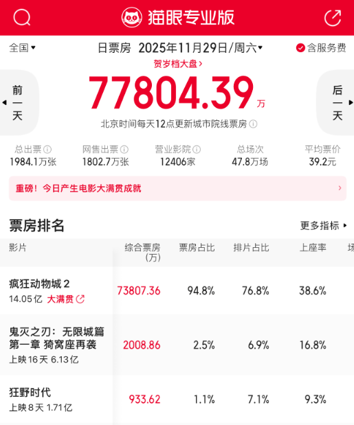 11月29日,一个再寻常不过的周六,影市一路“狂飙”,单日总票房达到7.78亿元,只《疯狂动物城2》一部电影就贡献了超过7亿元的票房。该影片超过《复仇者联盟4:终局之战》,成为中国内地影史进口片单日票房冠军,同时也是非春节档影片单日票房冠军。