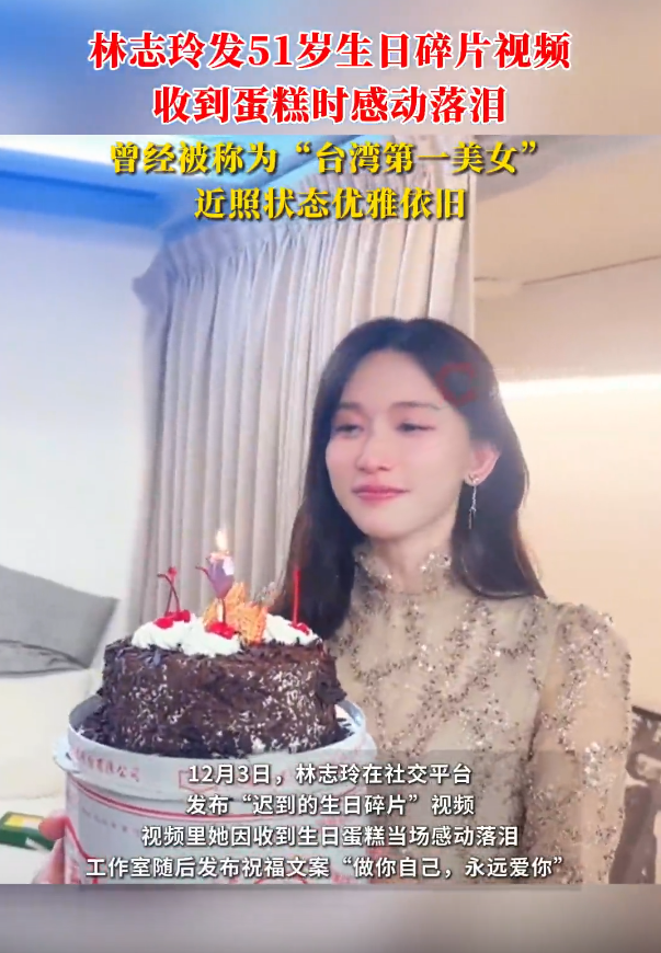 12月3日,林志玲在社交平台发布“迟到的生日碎片”视频。视频里她因收到生日蛋糕当场感动落泪,工作室随后发布祝福文案“做你自己,永远爱你”。