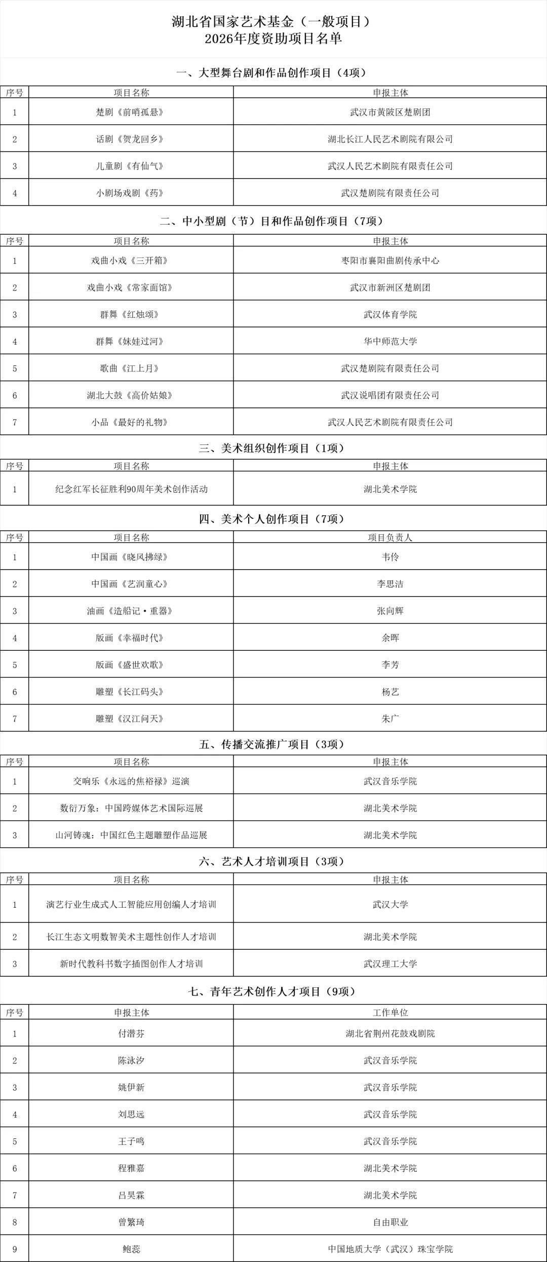 12月2日,国家艺术基金网站公示“国家艺术基金(一般项目)2026年度资助项目名单”,湖北省34个申报项目成功入选,位列全国第8,稳居中部地区首位。