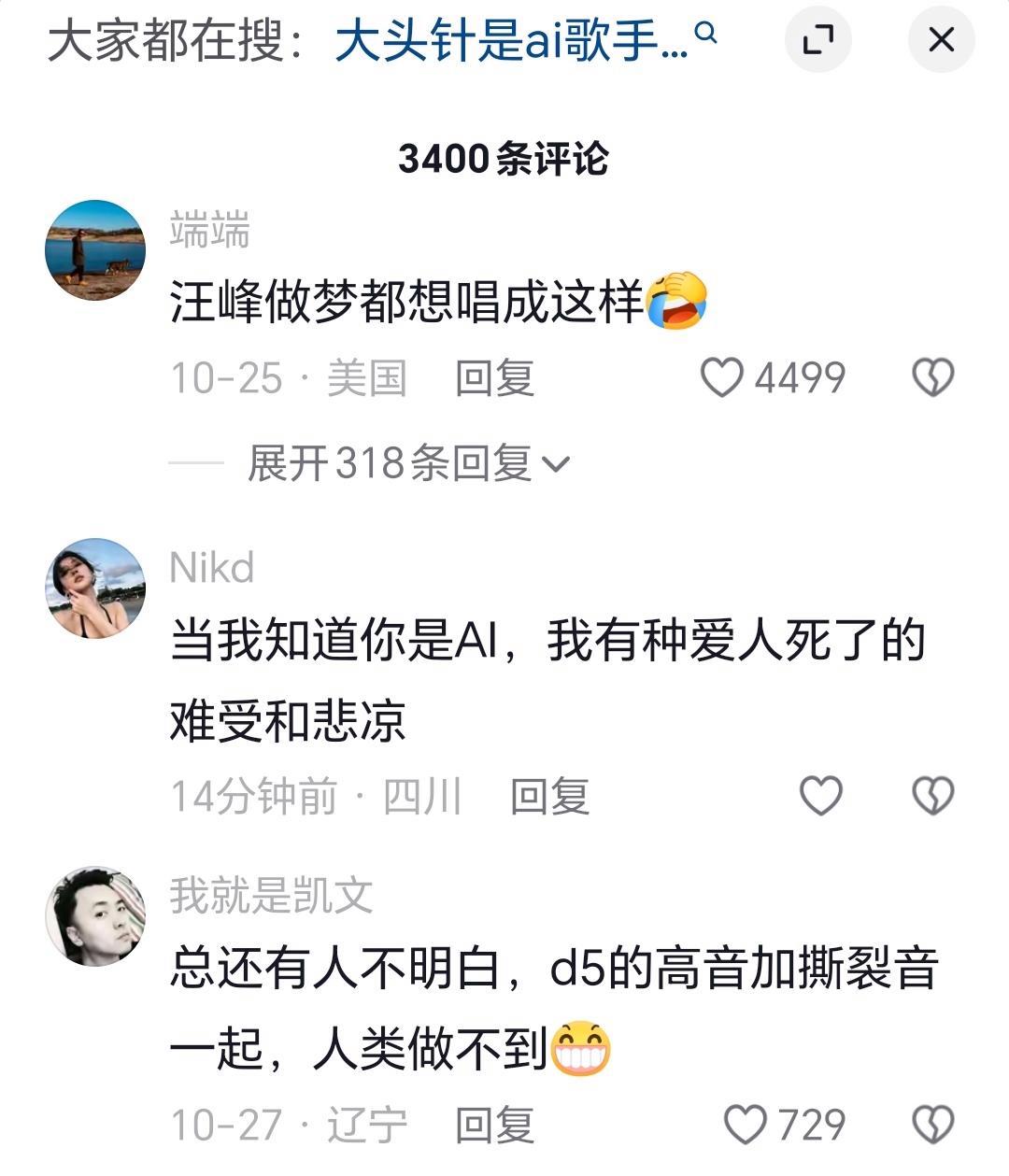 在网络上,无论是音乐人、乐评人还是网友,几乎一致认为“大头针”是AI。原因在于其声音表现远超常人:嗓音过于完美,《泪海》中爆发式的高音几乎非人类肉嗓所能及;同时,声音能根据不同歌曲呈现不同特点,如《坚持到底》的转音带有王力宏、陶喆的韵味,《泪海》的高亢则酷似张杰、汪峰。