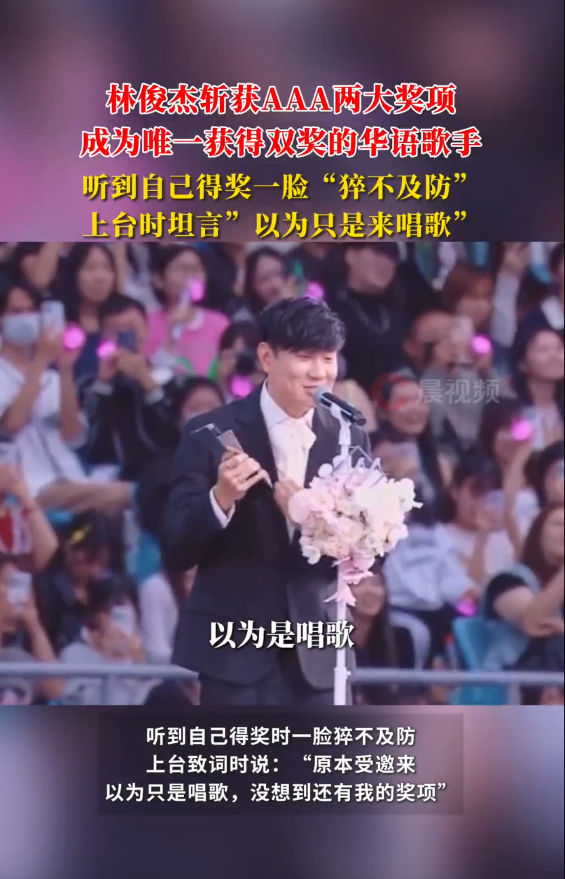 12月6日,林俊杰在2025年,AAA亚洲明星盛典上斩获亚洲明星奖,与最佳艺人奖两项荣誉,成为当晚唯一获得双奖的华语歌手。听到自己得奖时一脸猝不及防,上台致词时说:“原本受邀来以为只是唱歌,没想到还有我的奖项” 。