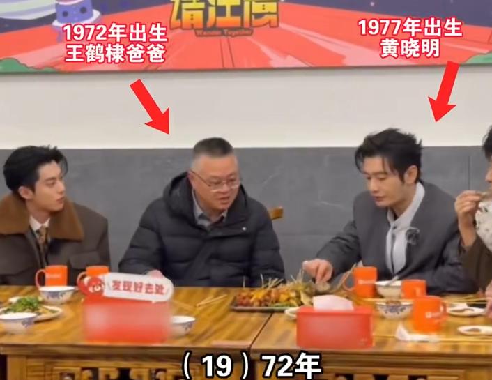 在录制现场,黄晓明想招呼王鹤棣爸爸吃东西,1977年生的他开口就管1972年出生的王鹤棣爸爸叫“叔叔”,喊完才反应过来不对劲。