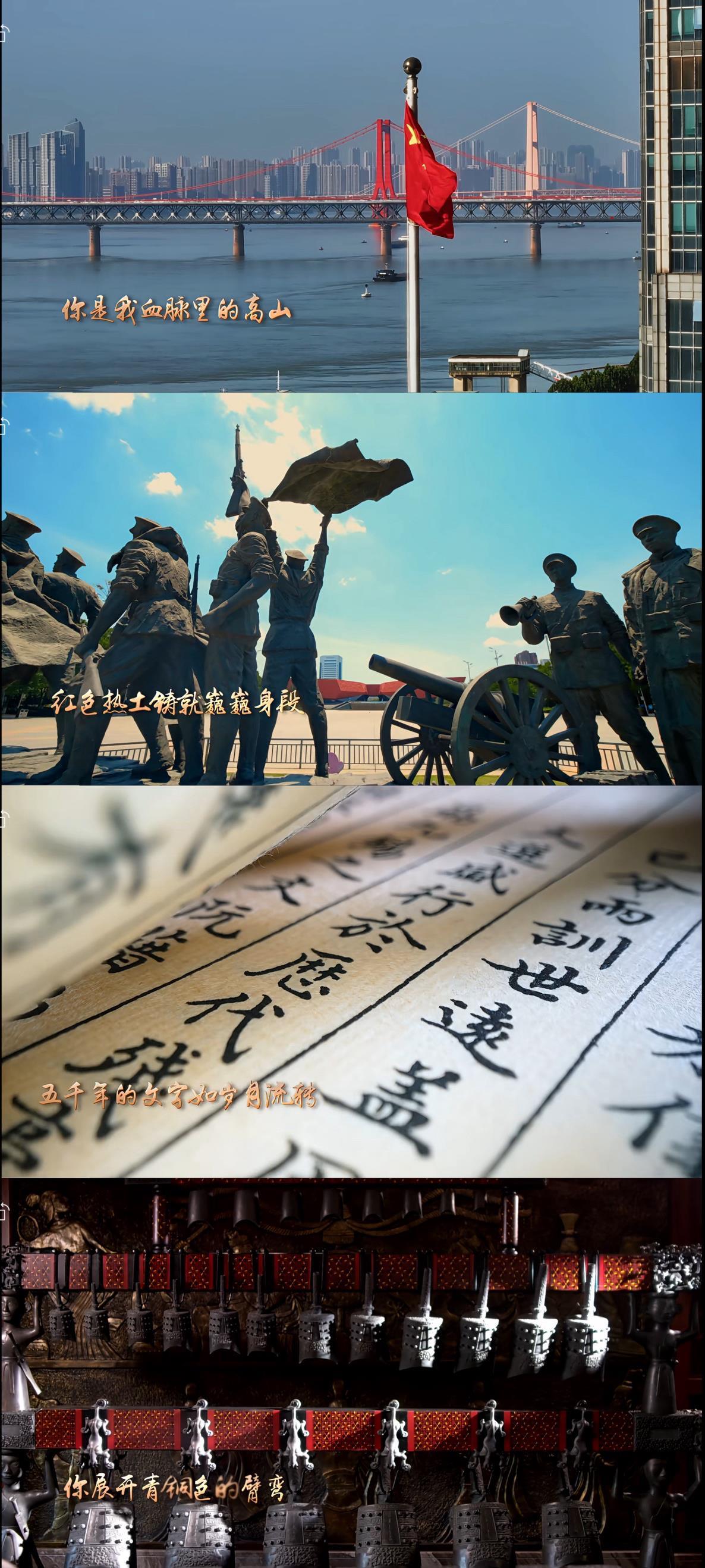 “你是我血脉里的高山,红色热土铸就巍巍身段,五千年的文字如岁月流转,你展开青铜色的臂弯,守护着沙滩与梯田。我听见长江在大声歌唱,涛声阵阵,叫醒人间烟火万户灯暖……”
