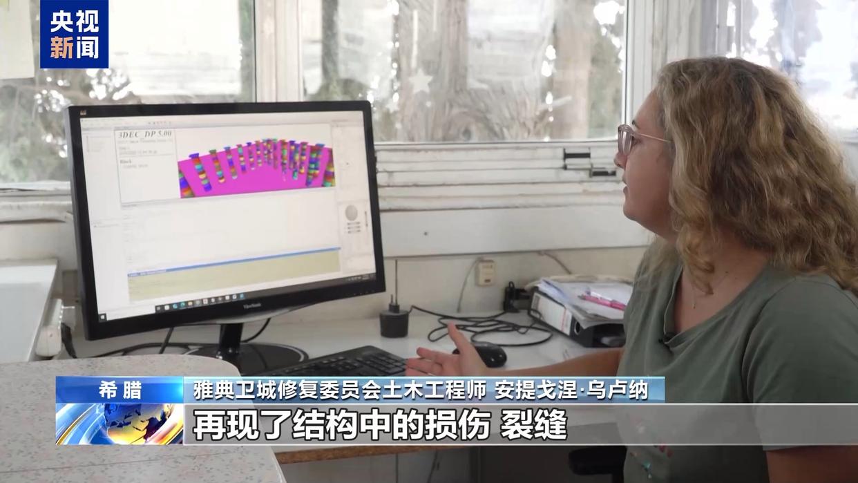 雅典卫城修复委员会土木工程师 安提戈涅·乌卢纳:我们在模型中数值化再现了结构中的损伤、裂缝,以及所有实际存在于结构中的问题,甚至包括即将实施的修复计划中将要涉及的部分。然后,我们就得到了建筑结构在地震作用下的行为表现,体现为变形或位移。