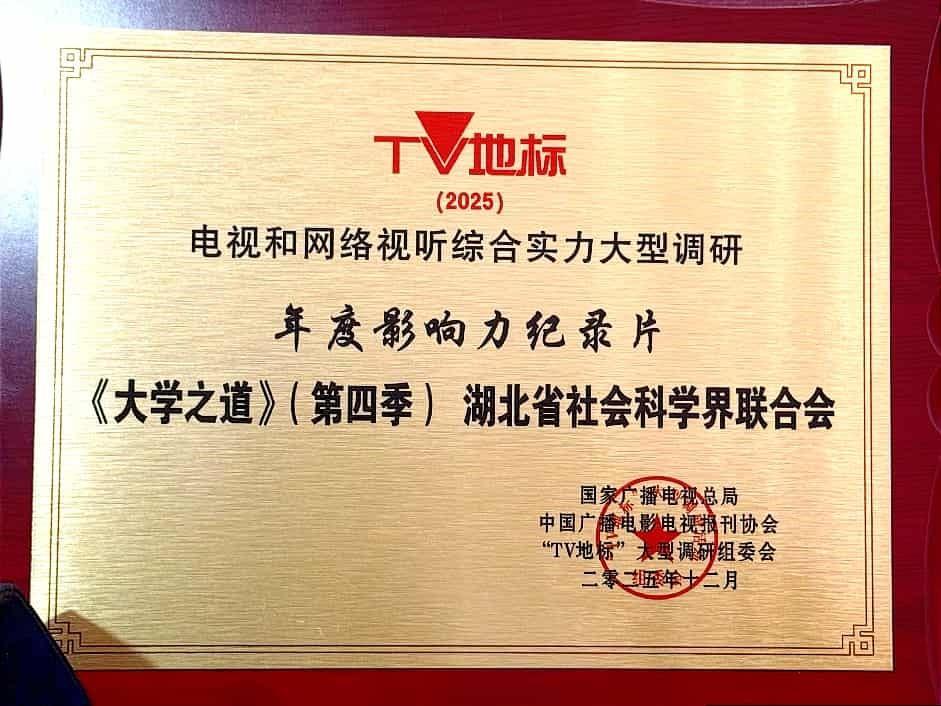 2025年12月19日,在北京举行的“TV地标(2025)”大型调研成果发布会上,国家广播电视总局中国广播影视报刊协会“TV地标”大型调研组委会,为湖北省社会科学界联合会牵头打造的国内首档大学生立德成长纪实节目《大学之道》第四季等9部作品颁发重量级奖项——“年度影响力纪录片奖”。同获该奖项的还有来自上海广电、苏州广电、广东卫视、深圳广电等单位选送的作品。