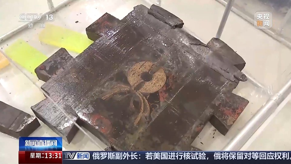 相较于外棺中棺的素面单彩,内棺纹饰更加炫丽丰富,龙鳞、凤羽清晰可见,且以朱、绿、金、银等颜色为主。内棺盖板上还曾放置两列共10枚玉璧。由于内棺上两横五纵的麻织棺束尚未揭取,覆盖了整个外棺表面约2/3,龙凤纹目前只显露出局部。
