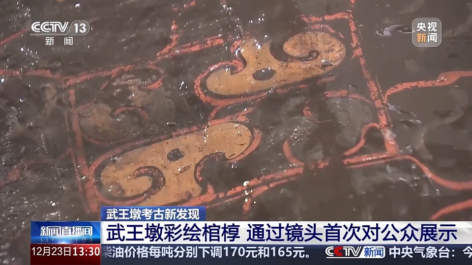 武王墩考古发掘项目队员 李凤翔:我现在称之为是那种“四兽云纹”,或者是云兽纹。它的特征是卷云纹的特征,然后兽就是因为它中间还有一个圆形的类似于眼睛的东西。然后中间用彩色的丝带那样的纹饰给它连接起来,覆盖到整个棺椁的外表面上,很简洁。