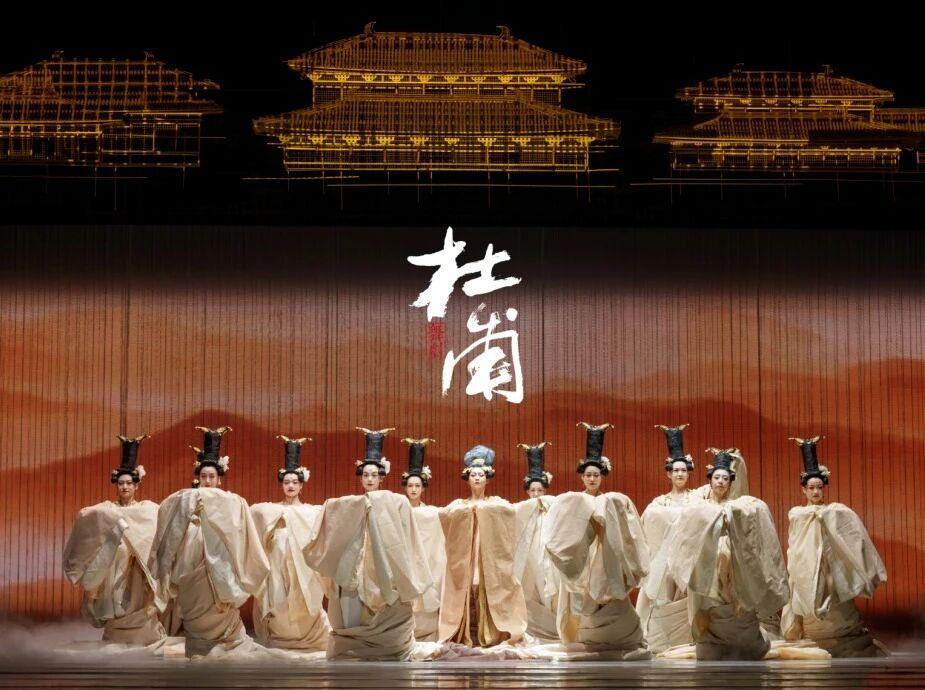 《杜甫》自2015年开始打造,2016年4月在重庆首演。该剧以杜甫诗歌为蓝本,采用大写意手法分序、上下篇及尾声四个篇章,通过“块状舞段”结构意象化展现杜甫求官、弃官的人生历程,提炼出“沉郁顿挫”的诗风融入舞蹈语言。而剧中还设置了两个“杜甫”时空对话,舞剧中的《丽人行》《兵车行》等片段,更是成为舞剧迷心中的高光。