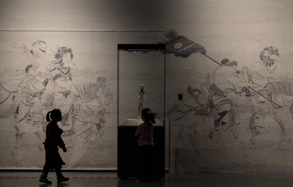 12月28日,两名儿童在参观六合同风——内蒙古地区铸牢中华民族共同体意识主题展。新华社记者 连振 摄