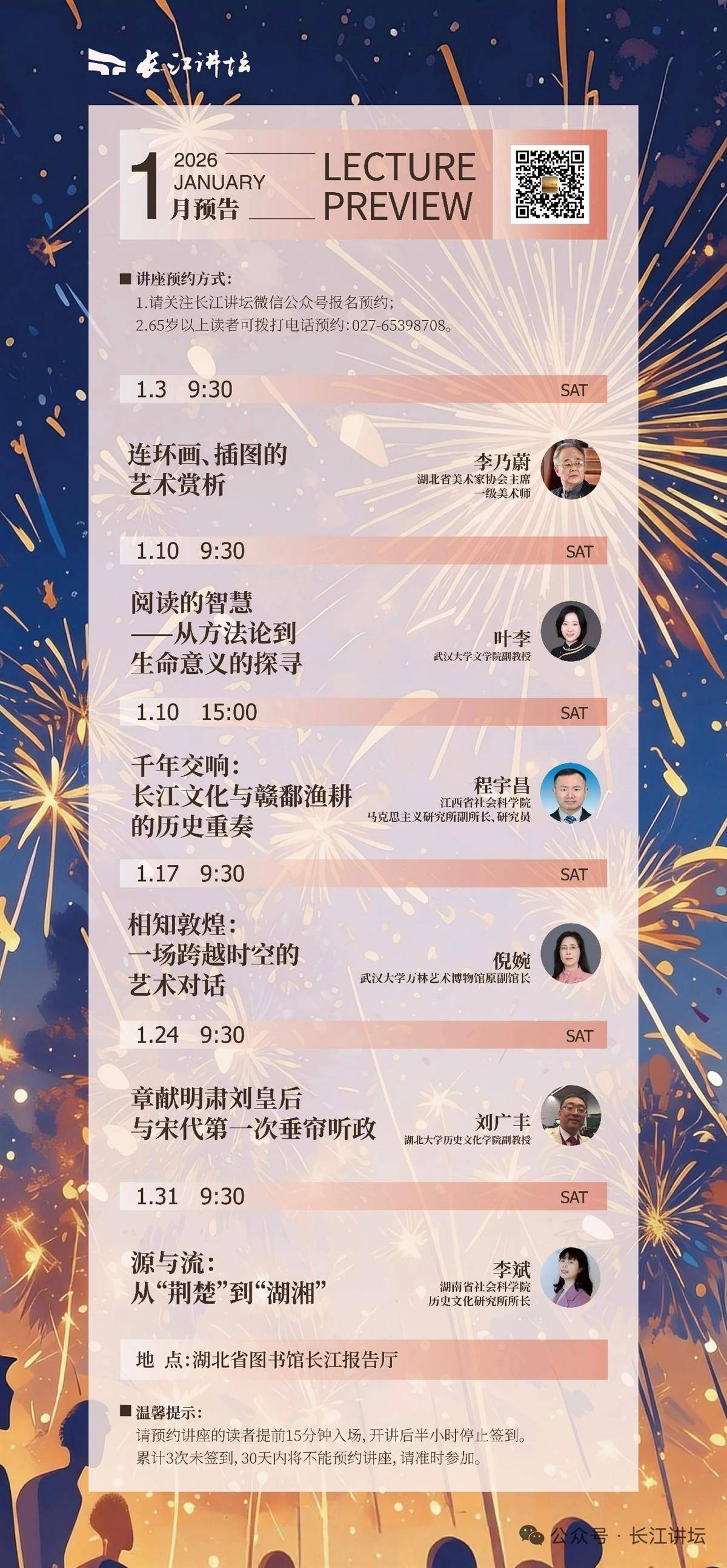 2026年的第一场长江讲坛来自湖北省美术家协会主席、一级美术师李乃蔚。1月3日,他将主讲“连环画、插图的艺术赏析”。连环画与插图,作为中国美术史上独具民族特色且大众基础深厚的艺术形式,曾在几代人的文化生活中扮演了不可替代的角色。它们既是视觉叙事的经典载体,也是连接文学与绘画、艺术与大众的重要桥梁。本期讲座,主讲人将通过分享多幅经典作品,带领大家重新认识连环画与插图这一兼具艺术性与通俗性的艺术瑰宝,感受其蕴含的深厚文化内涵。