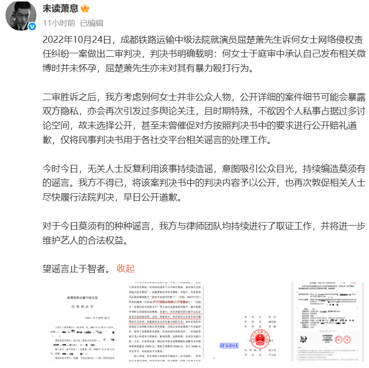 1月3日晚,该博主再次发文质问屈楚萧“是不是真的家暴?是不是真的变态?”对此,屈楚萧工作室于1月4日凌晨公开法院民事判决书,并发文否认家暴传言:“2022年10月24日,成都铁路运输中级法院就演员屈楚萧先生诉何女士网络侵权责任纠纷一案作出二审判决,判决书明确载明:何女士于庭审中承认自己发布相关微博时并未怀孕,屈楚萧先生亦未对其有暴力殴打行为。”