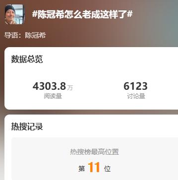 年轻时的陈冠希一直以“痞帅”形象著称,因为该照片和他年轻时相比变化太大,有不少网友看到后惊呼“完全认不出”,词条“陈冠希怎么老成这样了”也因此登上微博热搜榜。