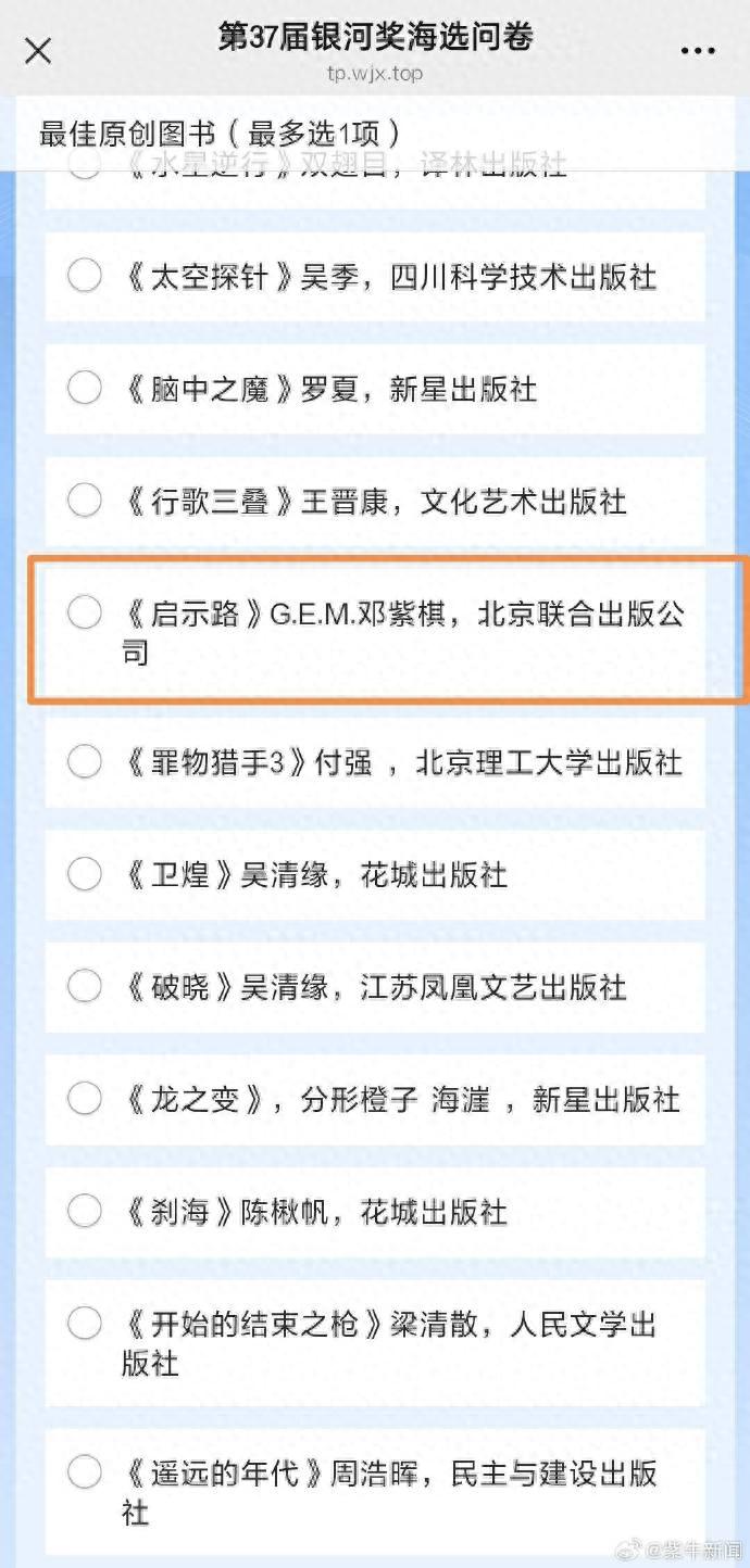 据扬子晚报,1月1日,第37届“银河奖”海选投票名单正式公布,其中,知名歌手邓紫棋2025年出版的长篇科幻小说《启示路》入选银河奖最佳原创图书票选名单。